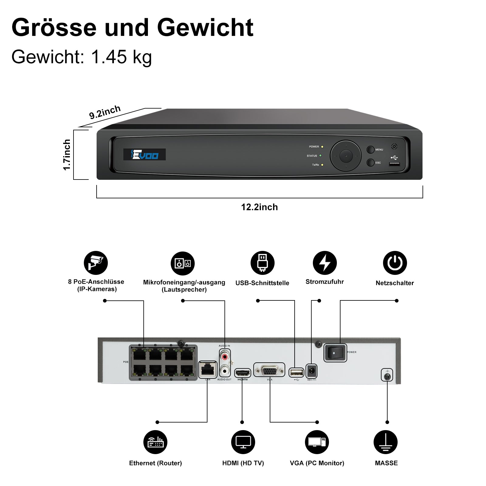 Sparen Sie wertvolle Zeit mit unserer Smart Playback-Technologie, die Ihnen ermöglicht, relevante Ereignisse in Sekunden zu finden. Mit 8-Kanal-4K-Aufnahmen behalten Sie alles im Blick – in ultra-hoher Auflösung und gestochen scharfer Qualität. Dank optimierter Speicheroptionen und effizienter Bandbreitennutzung erleben Sie zuverlässige Überwachung ohne Kompromisse. Perfekt für den privaten oder professionellen Einsatz, damit Sie sich immer sicher fühlen.